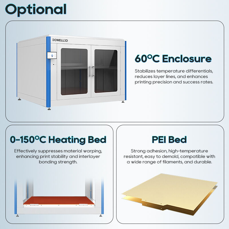 นอกเหนือจากคุณสมบัติพื้นฐานแล้ว เครื่องพิมพ์ 3 มิติของ DOWELL ยังมาพร้อมฟังก์ชันที่สามารถปรับแต่งได้ ซึ่งช่วยให้